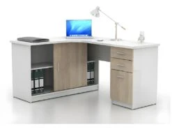 Bureau D’angle NORWY – 2 Portes & 2 Tiroirs – Blanc Et Chêne