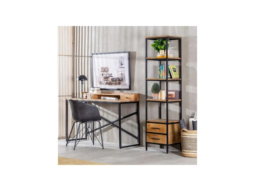 Aménagez un coin travail tendance mobilier Industriel avec ce bureau 2 tiroirs 1 niche proposant un plateau en bois de Manguier reposant sur une structure en métal.