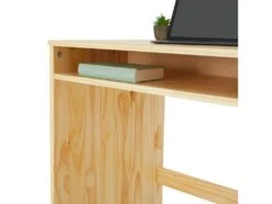 – Le bureau est fabriqué en pin massif recouvert d’un vernis à la finition naturelle.