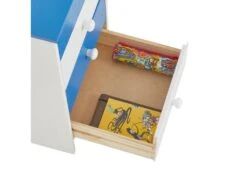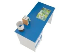 – Ce bureau est fabriqué en pin massif, lasuré en blanc et bleu.