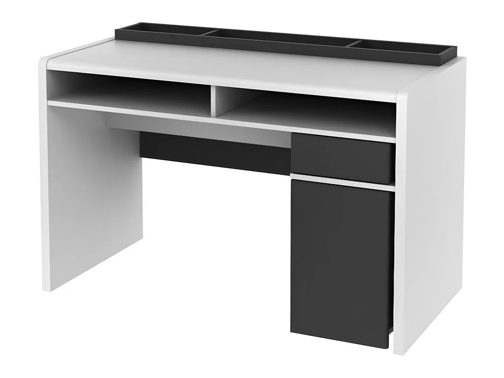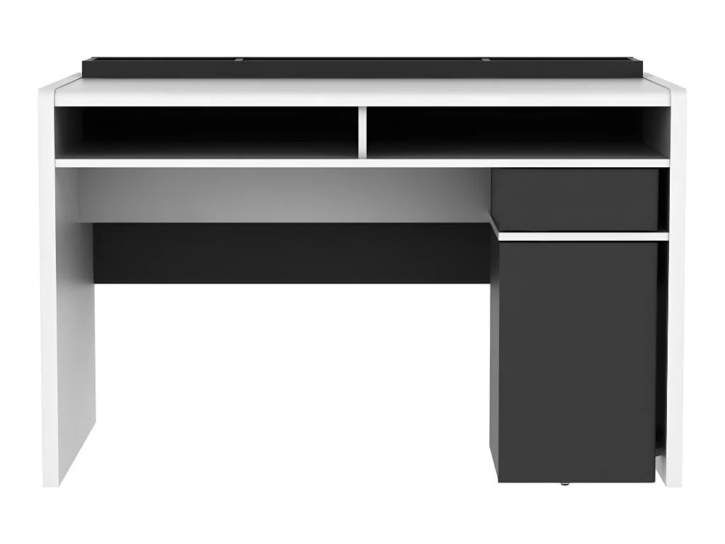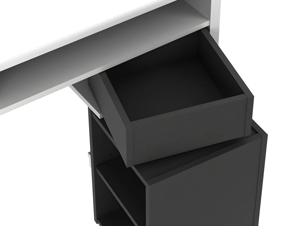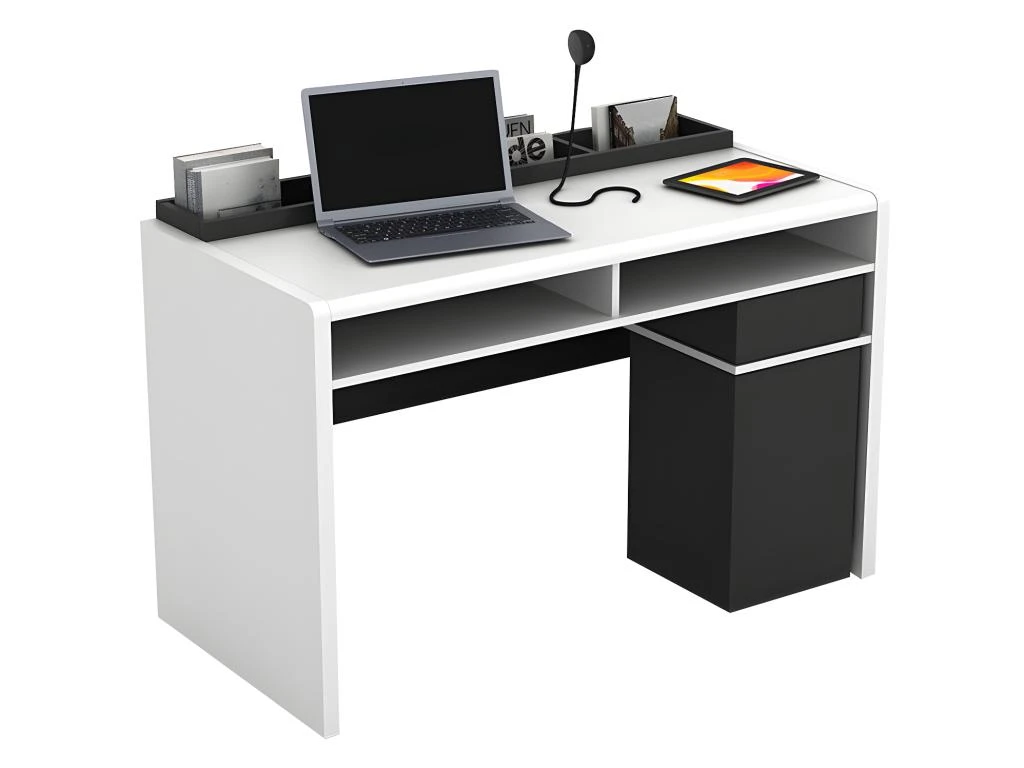 Le bureau ASERRI vous propose un plateau spacieux laissant de la place pour travailler confortablement. Aussi, divers rangements originaux et efficaces s’offrent à vous. En effet, vous bénéficierez de 3 grands espaces sur le plateau pour disposer votre matériel (stylos, trombones, agrafeuse…). Vous trouverez également deux niches classiques mais aussi deux niches et un tiroir pivotants dans lesquels ranger l’ensemble de vos documents.