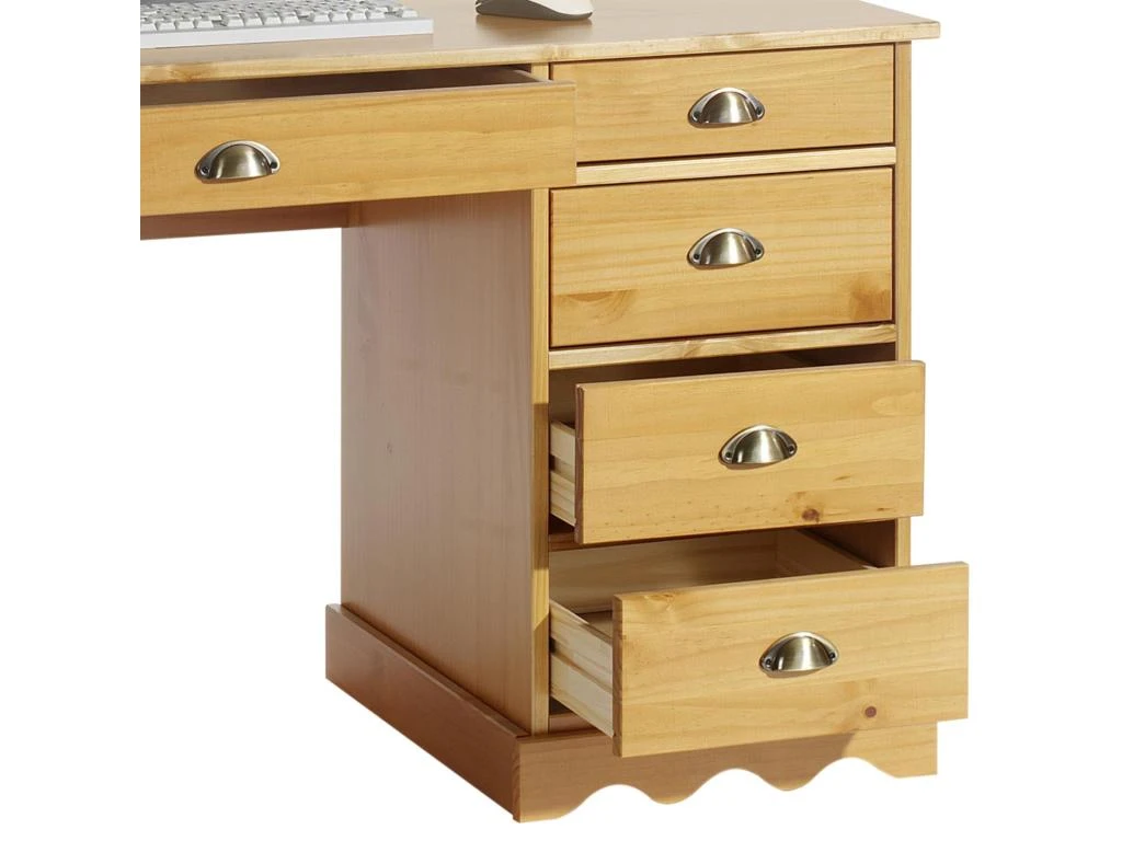 … avec son style classique est idéal pour meubler de manière élégante votre bureau. Doté de 5 tiroirs, 1 grand au centre et 4 plus petits sur le côté, il vous permettra d’organiser votre travail de façon optimale et de ranger toutes vos affaires personnelles. Les poignées en forme de coquille apportent une touche de charme supplémentaire à ce bureau et soulignent son style maison de campagne.