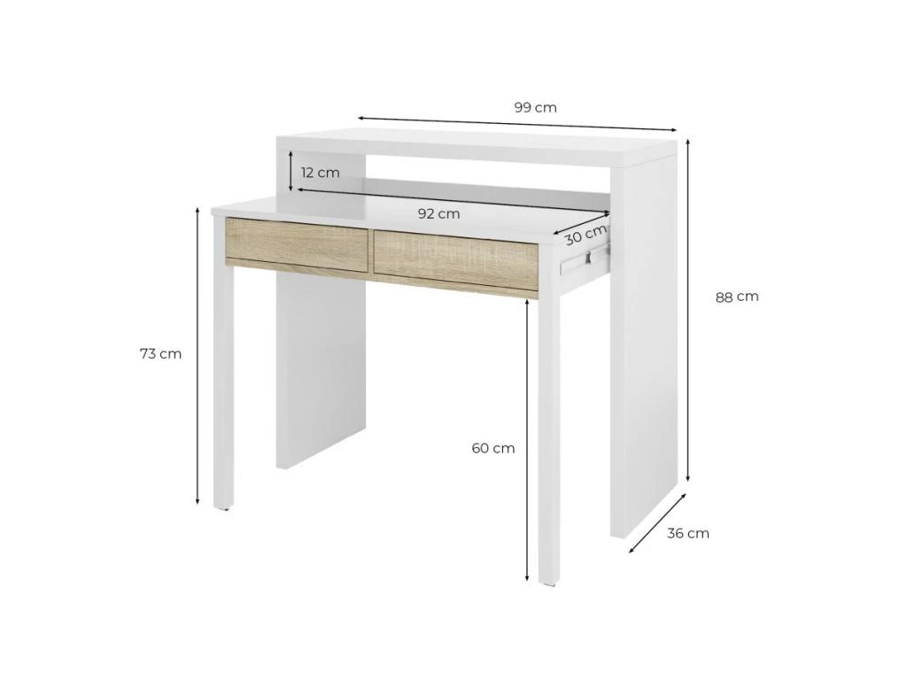 Sa partie extensible vous permettra d’ouvrir un bureau qui est composĂ© de 2 tiroirs pour vos petites affaires. De mĂŞme, le bureau est facilement repliable et se transforme en console d’entrĂ©e.