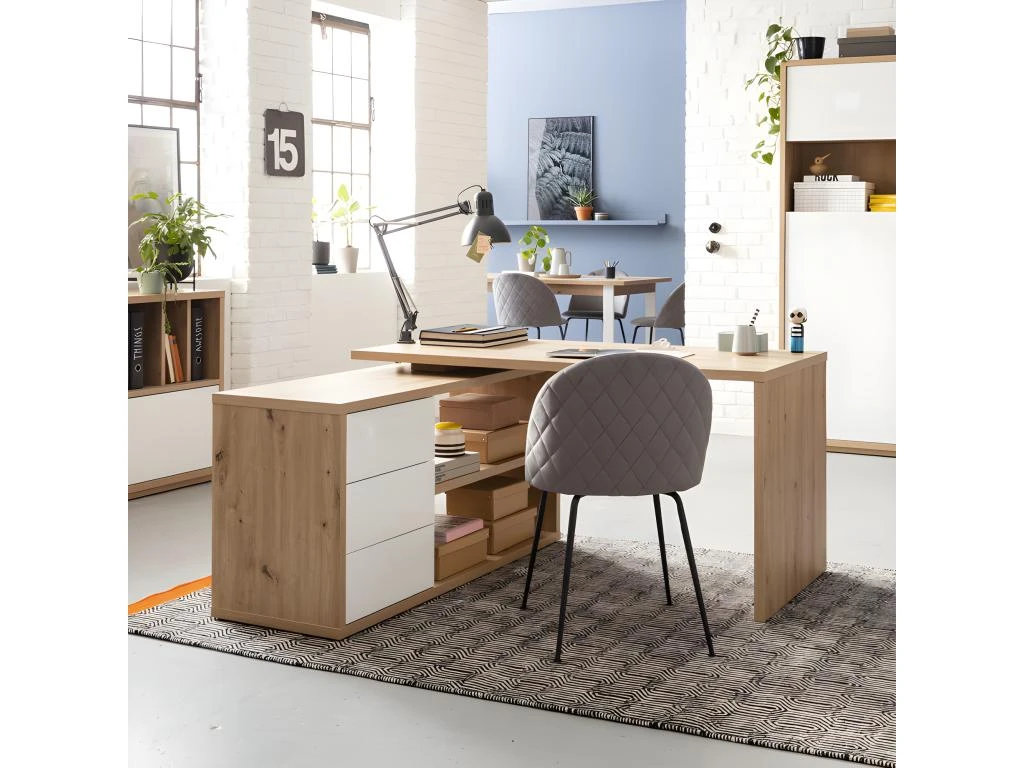 Optez pour le bureau d’angles 3 tiroirs et 2 espaces de rangement finition chêne texturé et blanc laqué ETHEL.