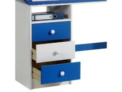 – Le bureau est fabriqué en pin massif, recouvert d’une lasure blanche et d’une lasure bleu.