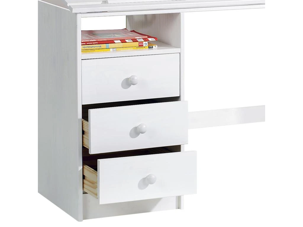 – Le bureau est fabriqué en pin massif, recouvert d’une lasure blanche.