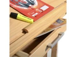 – Le bureau est fabriqué en pin massif et recouvert d’une lasure couleur hêtre.