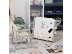 Complet et pratique, le bureau avec chaise Nicolas de MYCOCOONING dispose d’un tableau blanc effaçable en guise de table. Un rangement étagère double casier est disponible sous le bureau qui est aussi fourni avec 3 marqueurs de couleurs effaçables et un tampon-brosse. Les rebords lisses et arrondis empêchent vos enfants de se blesser.