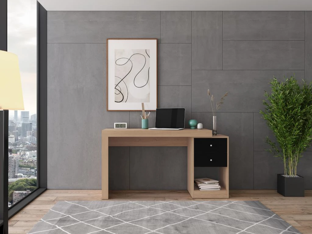 Fonctionnel et moderne, le bureau EVAN se différencie par son côté extensible, son style contemporain et son design destructuré. Grâce à ses deux tiroirs et sa niche, vous pourrez organiser votre espace de travail comme vous le souhaitez.