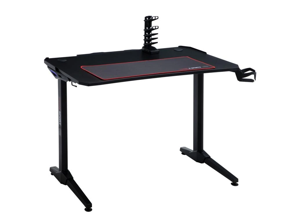 … rendra vos parties de jeu plus agréables grâce à ses multiples accessoires spécialement conçus pour le confort du joueur. Ainsi ce bureau gaming est équipé d’un porte-casque et d’un porte-bouteille afin de garder une boisson à portée de main tout au long de votre partie. Un porte-manettes est également inclus avec 4 ports USB afin de les recharger entre vos parties. Le design tendance, grâce au revêtement noir aspect carbone et aux LED bleues de 2 nuances présentes sur les cotés, plaira à tous les gamers !