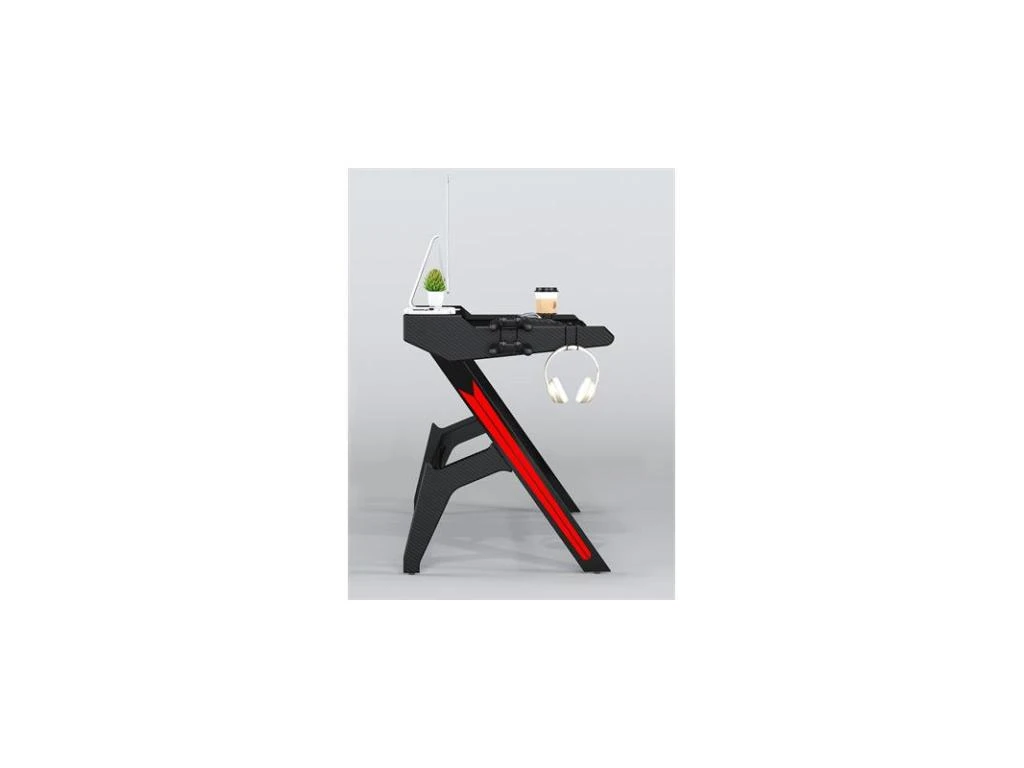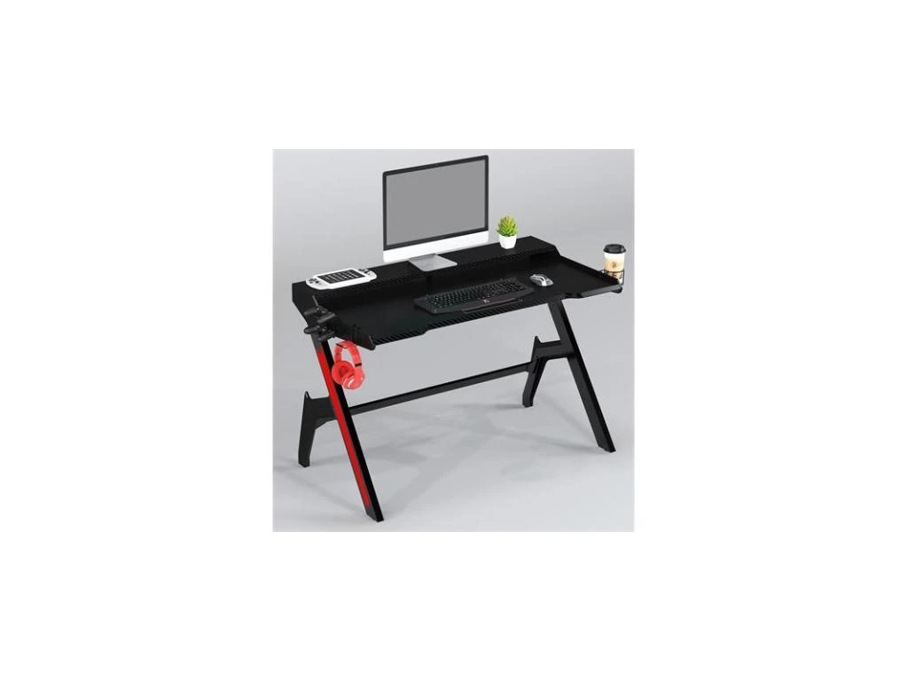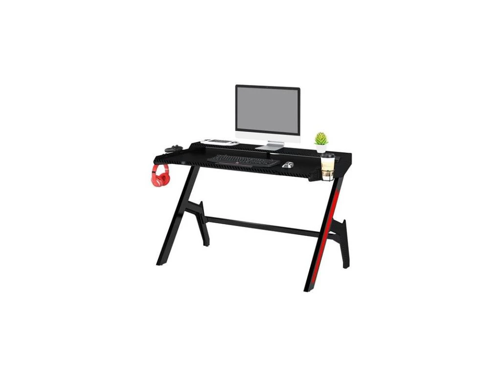 Le bureau gaming en bois mdf style fibre de carbone noir est composé de deux plateaux. Un petit de 120×193,5x18mm sur lequel vous pourrez poser votre ordinateur de bureau et quelques objets, et un plus large, plus bas de 3,7cm, sur lequel vous pourrez placer le clavier, la souris, et tout autre matériel nécessaire. Vous trouverez des crochets sur le côté gauche pour accrocher par exemple un casque, et un porte-gobelet sur le côté droit.