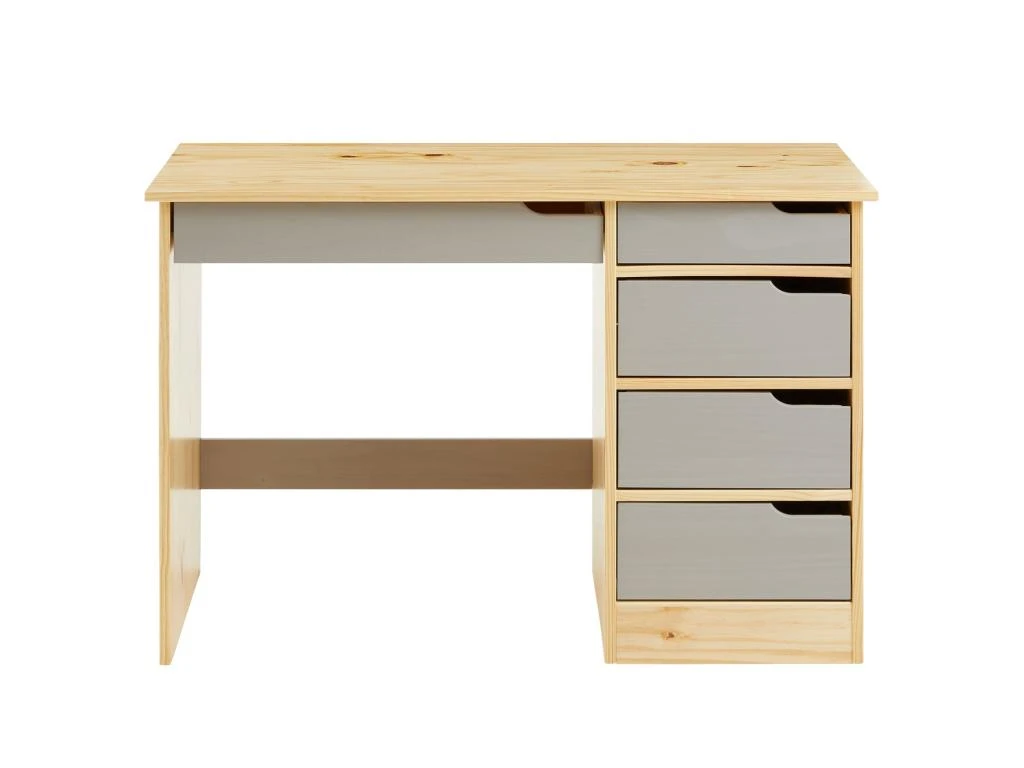 – Le bureau est fabriqué en pin massif recouvert d’un vernis naturel et d’une lasure grise.