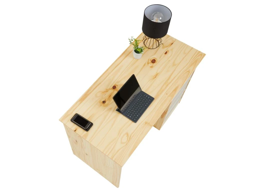… est un bureau naturel qui est construit uniquement avec du bois et des vis. La madrure naturelle du pin et les ouvertures biseautées des tiroirs feront sensation, en référence à la tendance nordique actuelle. Le bureau est doté de trois grands tiroirs et d’un plus petit juste au dessus. Vous aurez ainsi de nombreuses possibilités pour y ranger vos affaires. Astucieux : le large tiroir sous le bureau offre suffisament de place pour y ranger votre clavier.