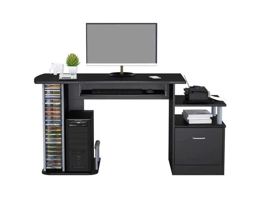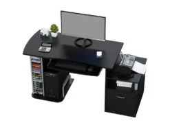 Le bureau informatique en bois noir est issu de notre savoir-faire en matière de fabrication. Il vous offrira un espace multimédia parfaitement organisé. Ses multiples étagères permettent d’avoir tout son matériel à portée de main. Vous gagnerez de la place grâce à la tablette coulissante pour le clavier de votre ordinateur. Des rangements sont prévus pour le matériel informatique tel que l’unité centrale, l’imprimante ou les CD.