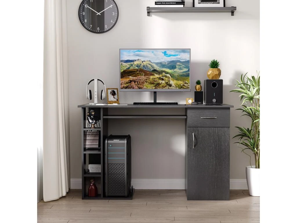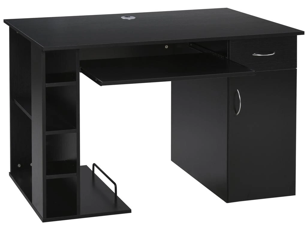 – Grand espace de rangement : plateau spacieux, tablette clavier coulissante, 1 tiroirs, niche, espace unité centrale, étagères