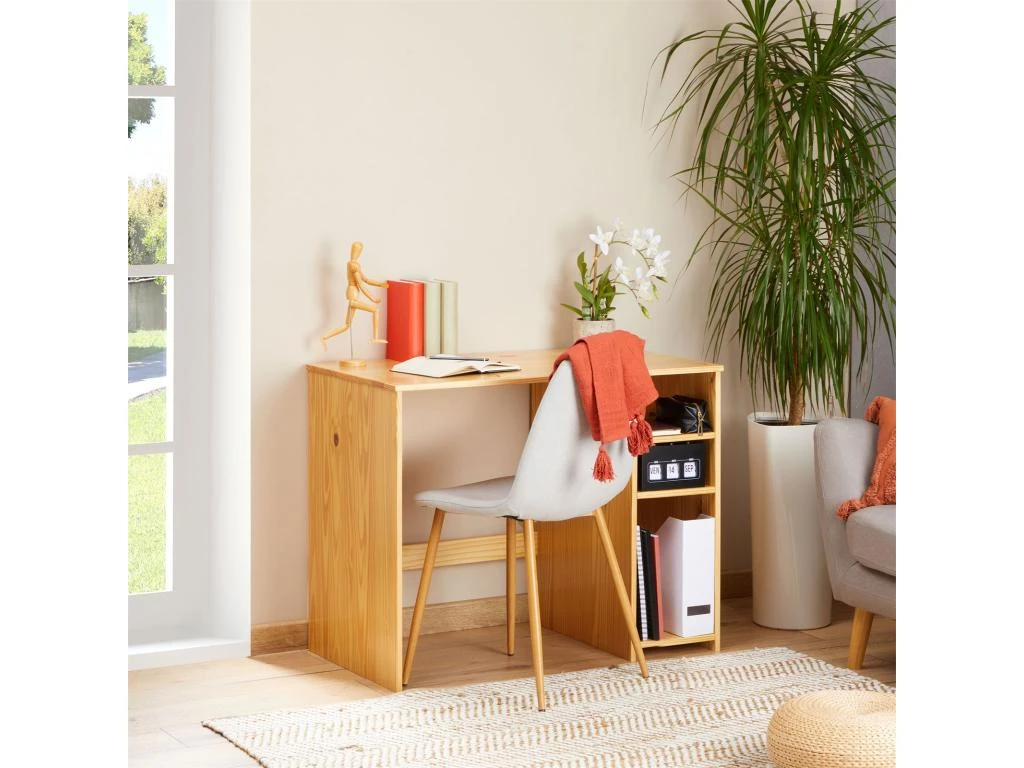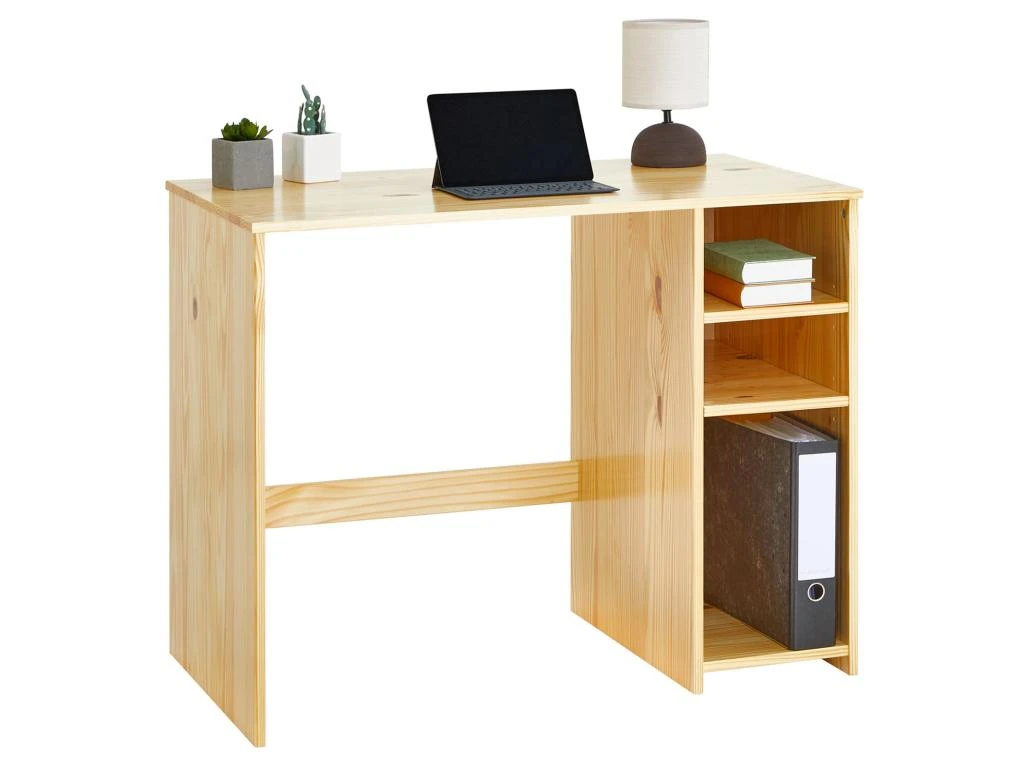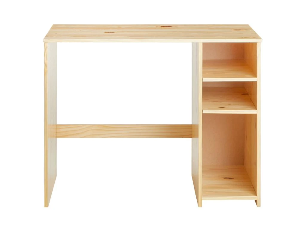 – Le bureau est fabriqué en pin massif recouvert d’un vernis naturel.