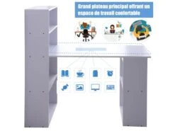 Mycocooning vous propose un bureau très fonctionnel avec le bureau Elina. Polyvalent, ce bureau informatique vous permet d’aménager votre entreprise ou votre domicile sans perte d’espace. Son design contemporain et sobre s’intègre partout. Le plateau offre un grand espace de travail permettant de disposer des documents et un ordinateur portable pour travailler ou étudier confortablement. Le rangement est optimisé : des étagères sont disposées de part et d’autre du plan de travail, facilitant l’accès aux livres, documents ou collations. Robuste et d’entretien facile, ce bureau bibliothèque est livré avec une notice de montage illustrée.
