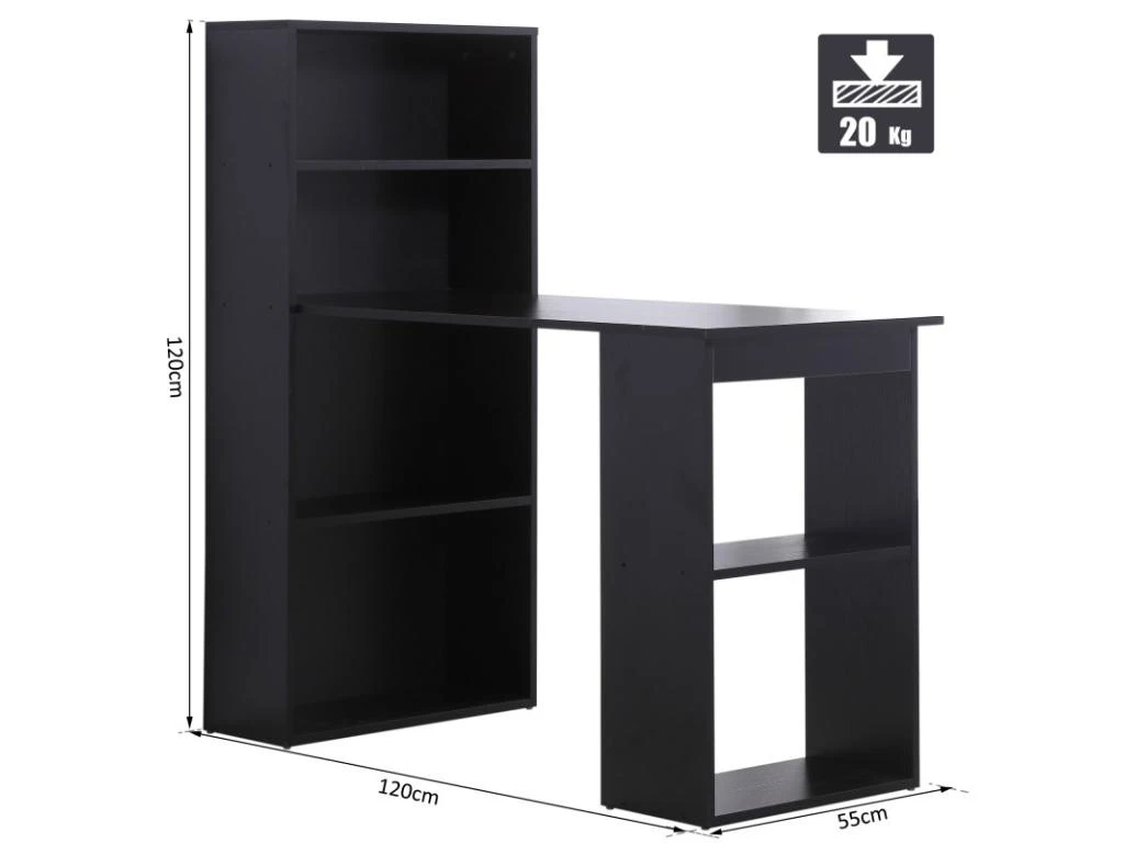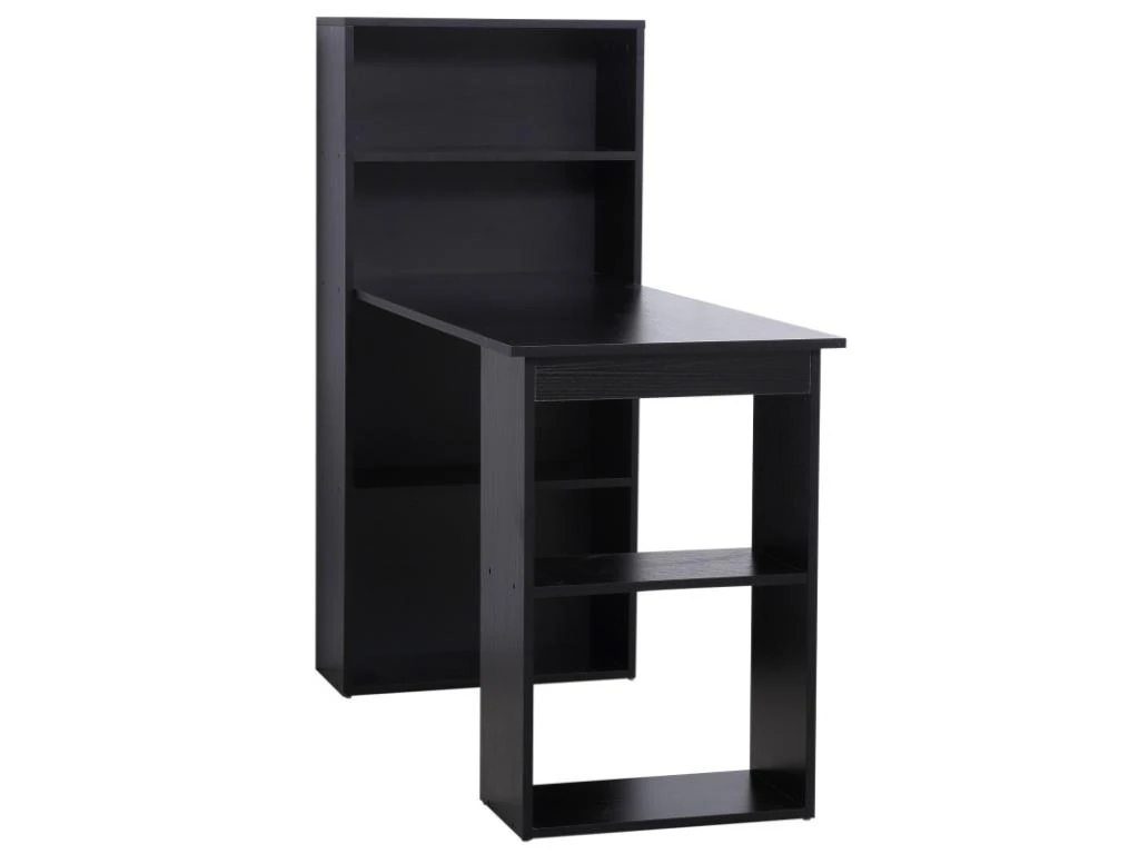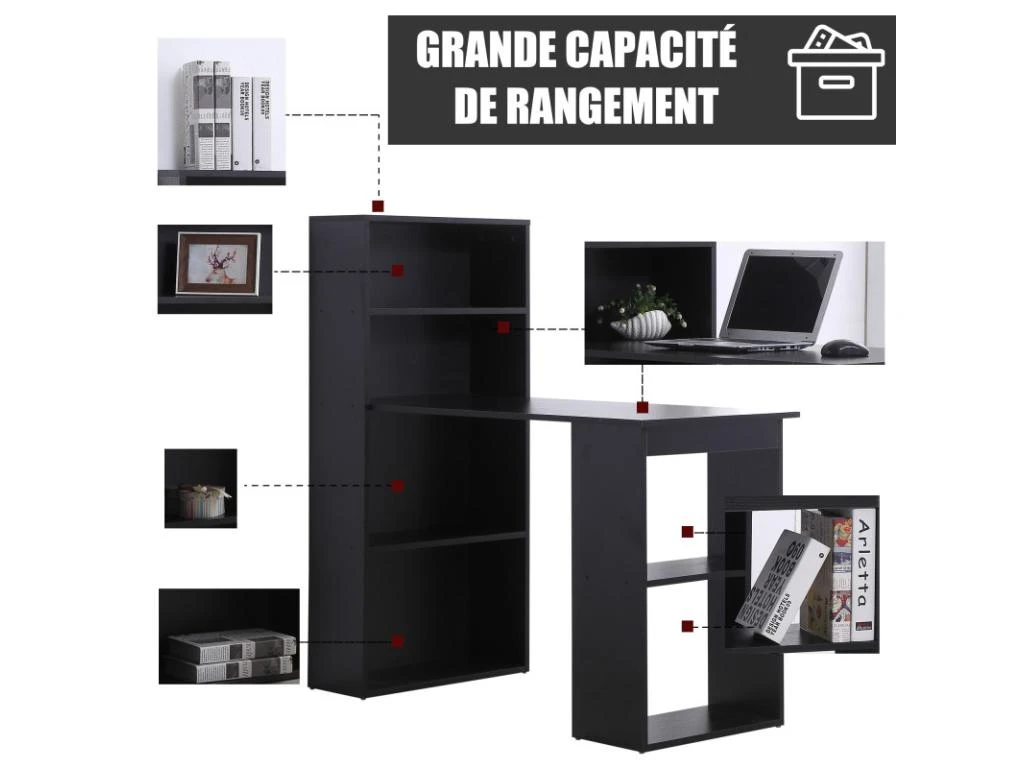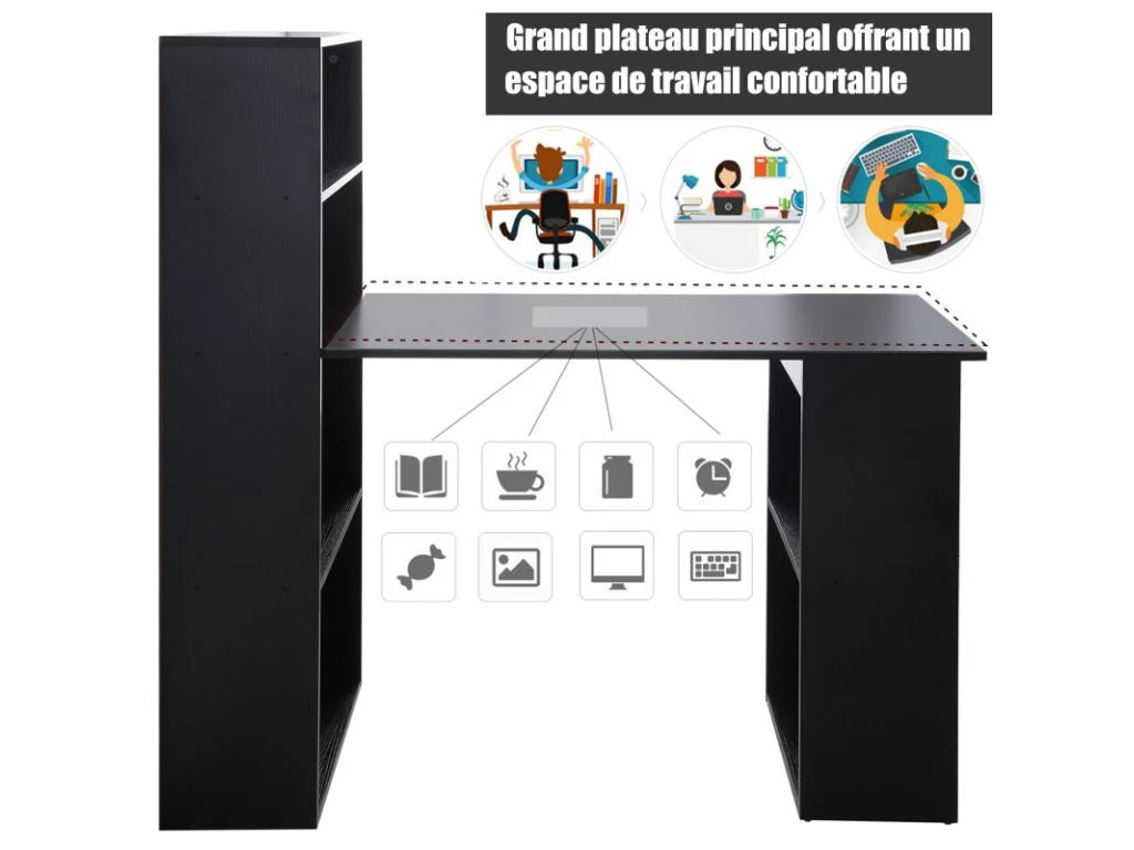 Notre bureau informatique polyvalent au design moderne peut être aisément assemblé grâce à sa notice. Il dispose d’un grand plateau principal qui permet de travailler dans le confort. De plus, il est muni de deux étagères. La première est compartimentée en quatre placards tandis que la seconde est segmentée en deux niches inférieures pour optimiser le rangement. Par ailleurs, notre bureau informatique de couleur noire est fabriqué en panneaux de particules pour lui offrir une résistance optimale.