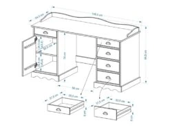 – Le bureau est fabriqué en pin massif recouvert d’une lasure blanche.