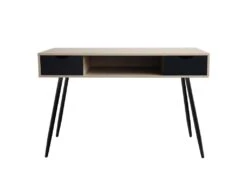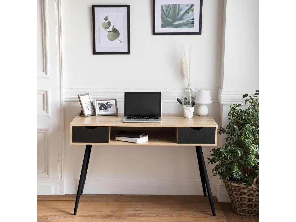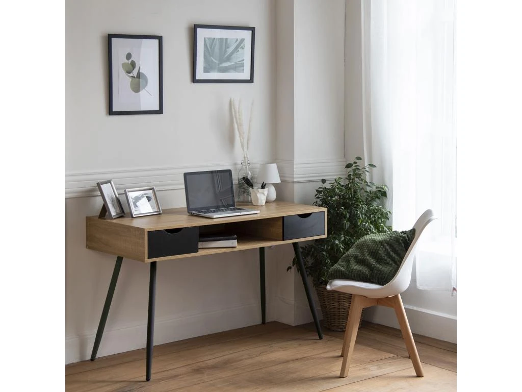Choisissez ce bureau scandinave BJORN fabriqué en bois naturel pour constituer votre espace de travail personnel chez vous et qui s’adapte aisément à la déco de votre pièce. Facile à monter, il comporte un caisson conçu en bois d’une couleur naturelle qui laisse un espace ouvert au milieu pour un rangement supplémentaire aux deux tiroirs qui se situent sur les côtés. Les quatre pieds en métal noir lui assurent une bonne stabilité. Son design géométrique, ses lignes épurées et son design minimaliste font de ce bureau scandinave un meuble qui s’intègre parfaitement à tous les intérieurs, quel qu’en soit le style. Que ce soit pour le télétravail, des activités manuelles ou pour vos loisirs, ce bureau de style nordique en bois et métal est idéal pour aménager un coin bureau avec un effet déco tendance.