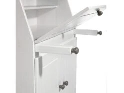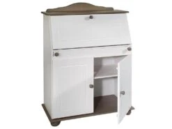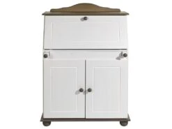 Bureau Secrétaire DAVID Avec Abattant Rangement Plusieurs étagères 2 Portes Plan De Travail Rabattable, En Pin Massif Taupe Et Blanc