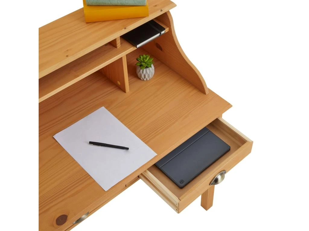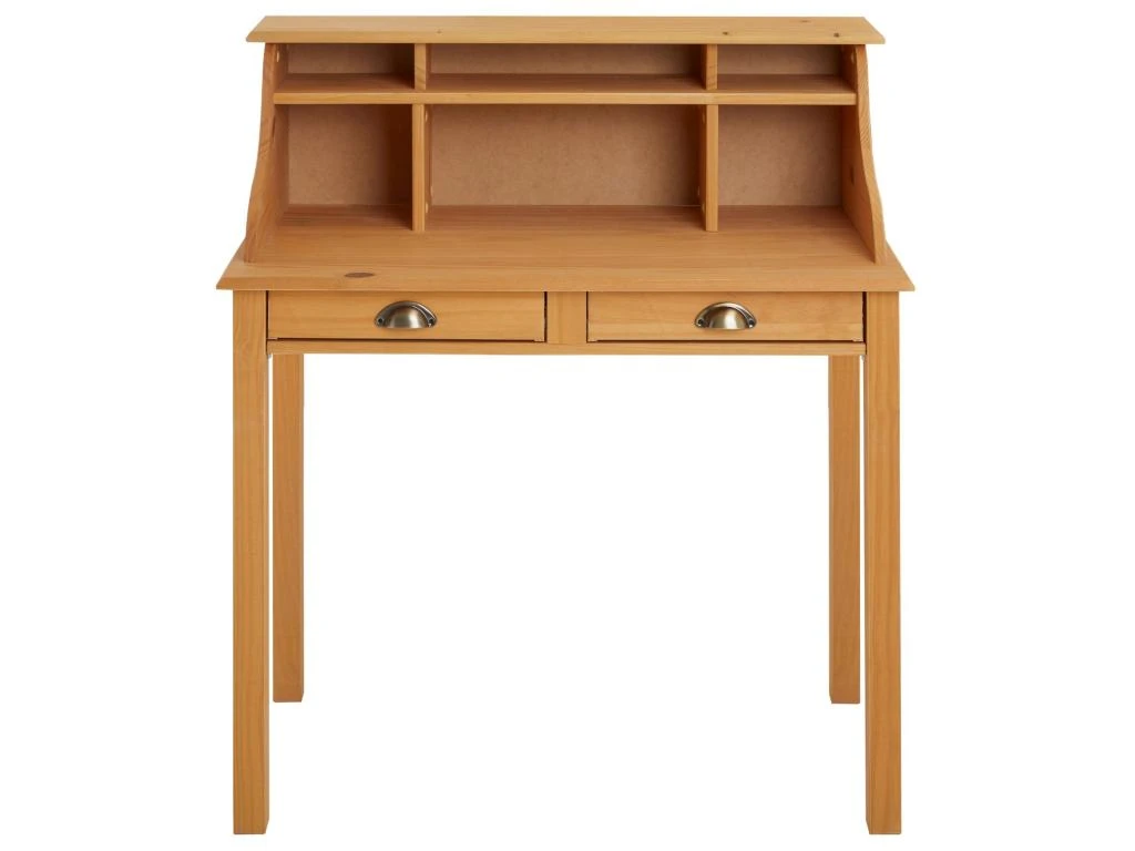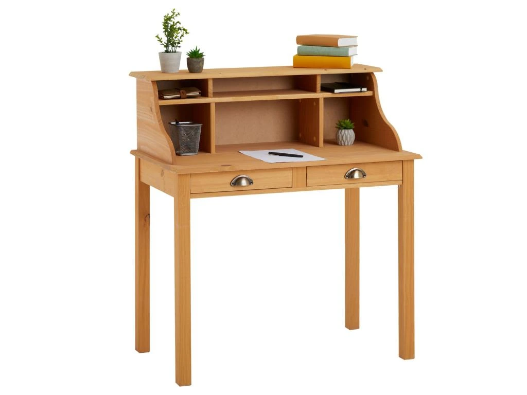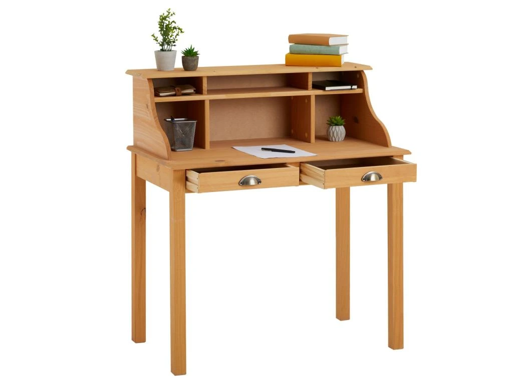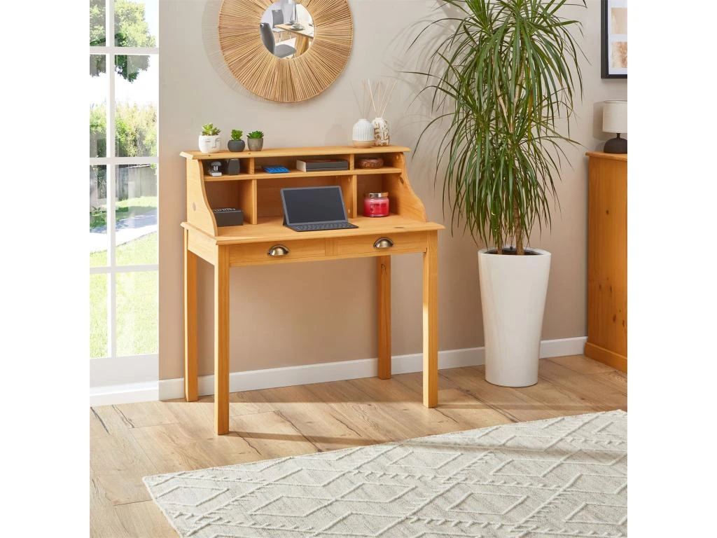 … apportera un style à la fois rustique et élégant à votre pièc de travail. Avec ses compartiments ouverts et ses 2 tiroirs, ce meuble peut aussi faire office de table console et vous permettra d’y ranger toutes vos affaires. Sa structure en pin massif le rend solide et robuste tout en gardant un esprit maison de campagne, qui se mariera parfaitement dans votre bureau, salon ou entrée !