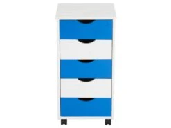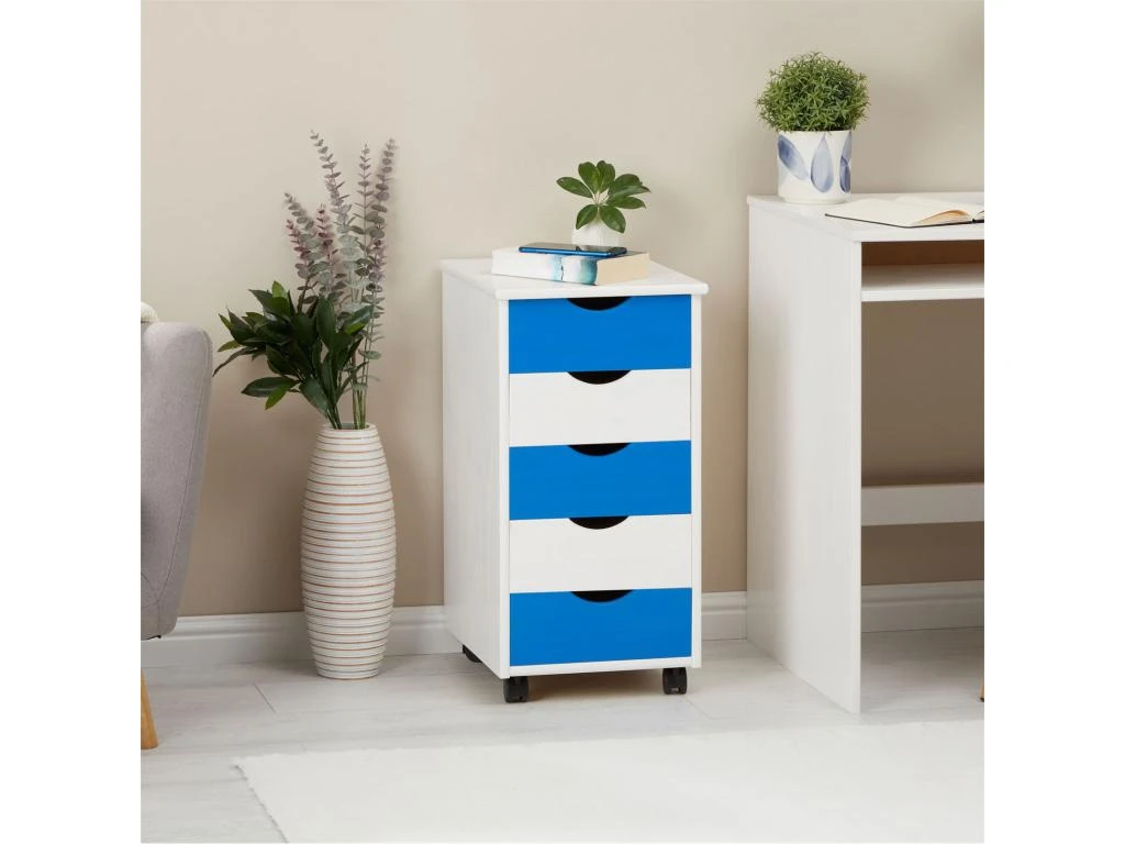 Caisson De Bureau LAGOS Meuble De Rangement Sur Roulettes Avec 5 Tiroirs, En Pin Massif Lasuré Blanc Et Bleu