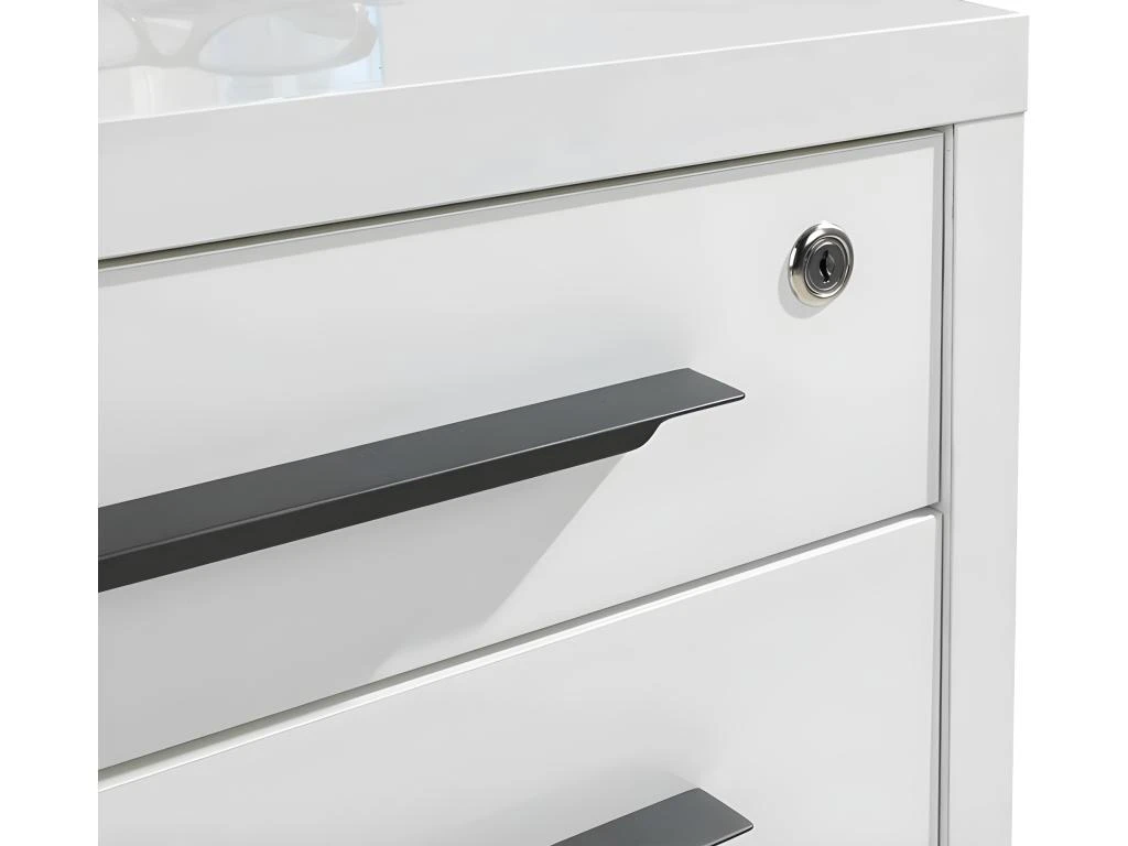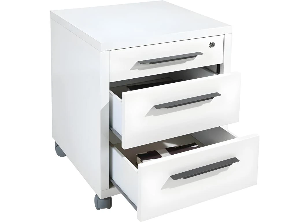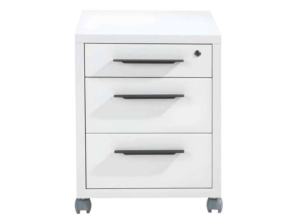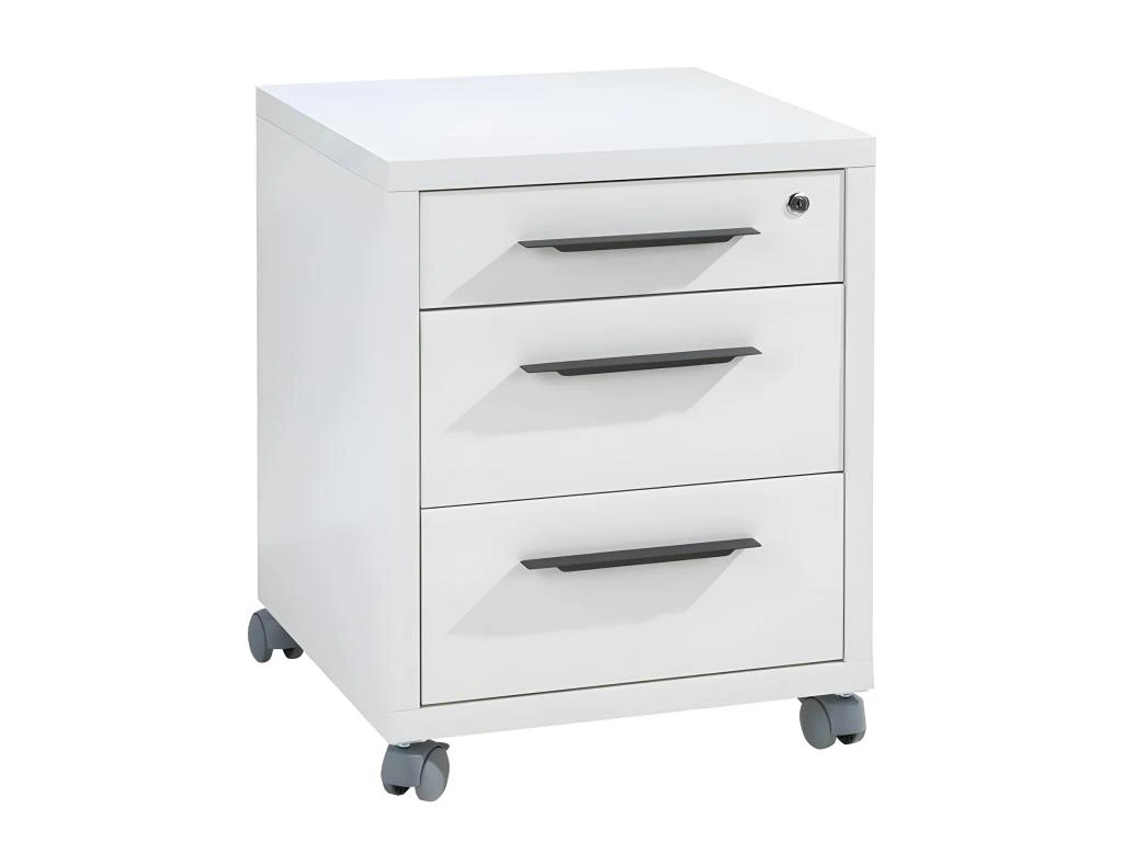 Un caisson de rangement à roulettes idéal pour optimiser vos rangements. Pratique, il se glisse sous le plateau de votre bureau. Constitué de 3 tiroirs dont le supérieur possède une fermeture sécurisée avec une serrure, il s’harmonise parfaitement avec le bureau de la collection NET. Blanc laqué, il apporte modernité et sera idéal pour un espace de travail épuré. On aime ses poignées grises. Découvrez le mobilier de bureau NET, des meubles au design simple qui s’adaptent à vos besoins et vous facilitent le quotidien.