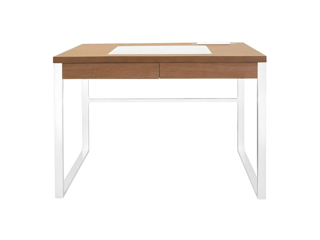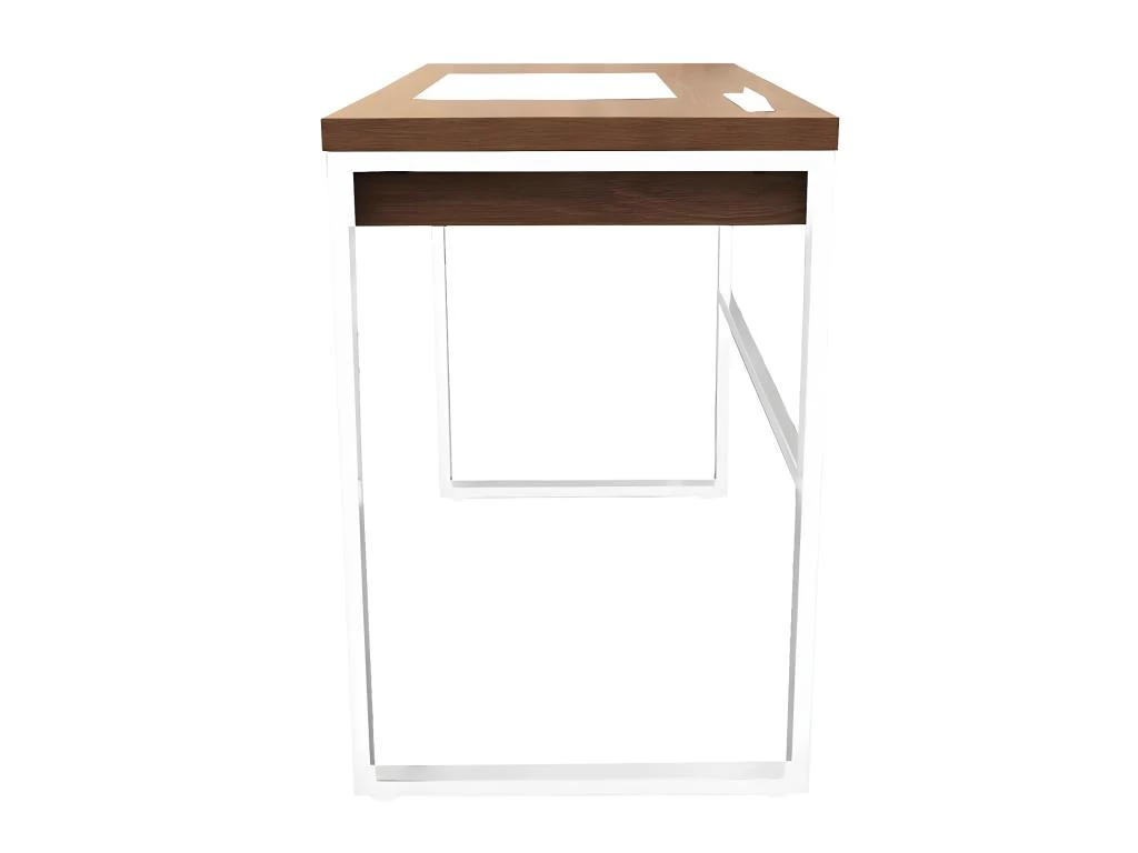 Piètement métallique coloris blanc. Plateau en panneaux de particules, finition effet bois. Sous-main revêtement simili cuir blanc.