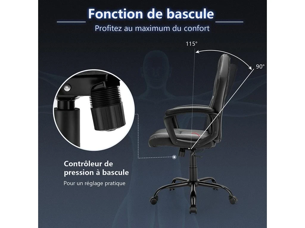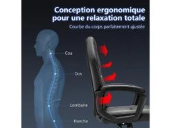 - Notre fauteuil Gaming pour la maison et le bureau vous offre une bonne assise ! Le siège rembourré très épais est garni d’une éponge élastique pour soutenir votre corps en douceur : vous pourrez supporter une assise prolongée. Le dossier ergonomique s’adapte parfaitement à votre morphologie et soutient votre cou, votre dos et votre bassin afin de limiter la tension exercée sur votre corps. De plus, les deux accoudoirs offrent un appui supplémentaire. Le fauteuil est recouvert d’un simili cuir doux et d’un tissu en maille respirante pour davantage de confort. Ce produit est fiable : le piètement robuste à 5 branches soutient solidement le siège et assure la stabilité de l’ensemble pour un poids maximum supporté de 120 kg.
