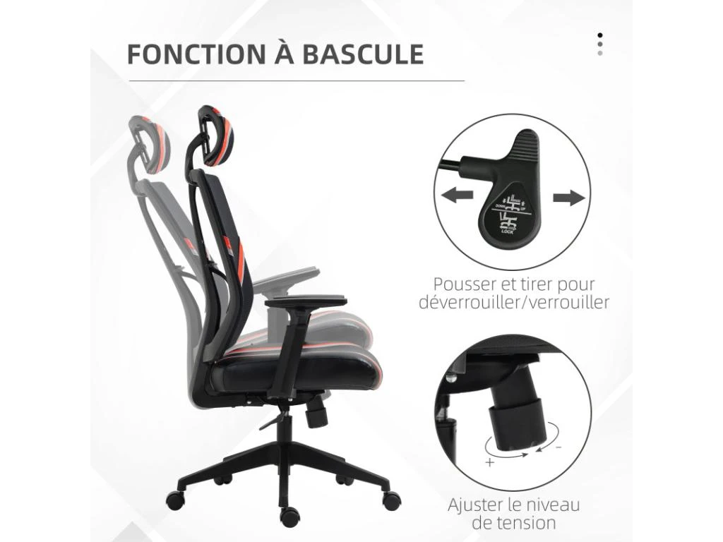 – Hauteur d’assise, des accoudoirs et de la tétière réglables pour position idéale de travail ou de gaming