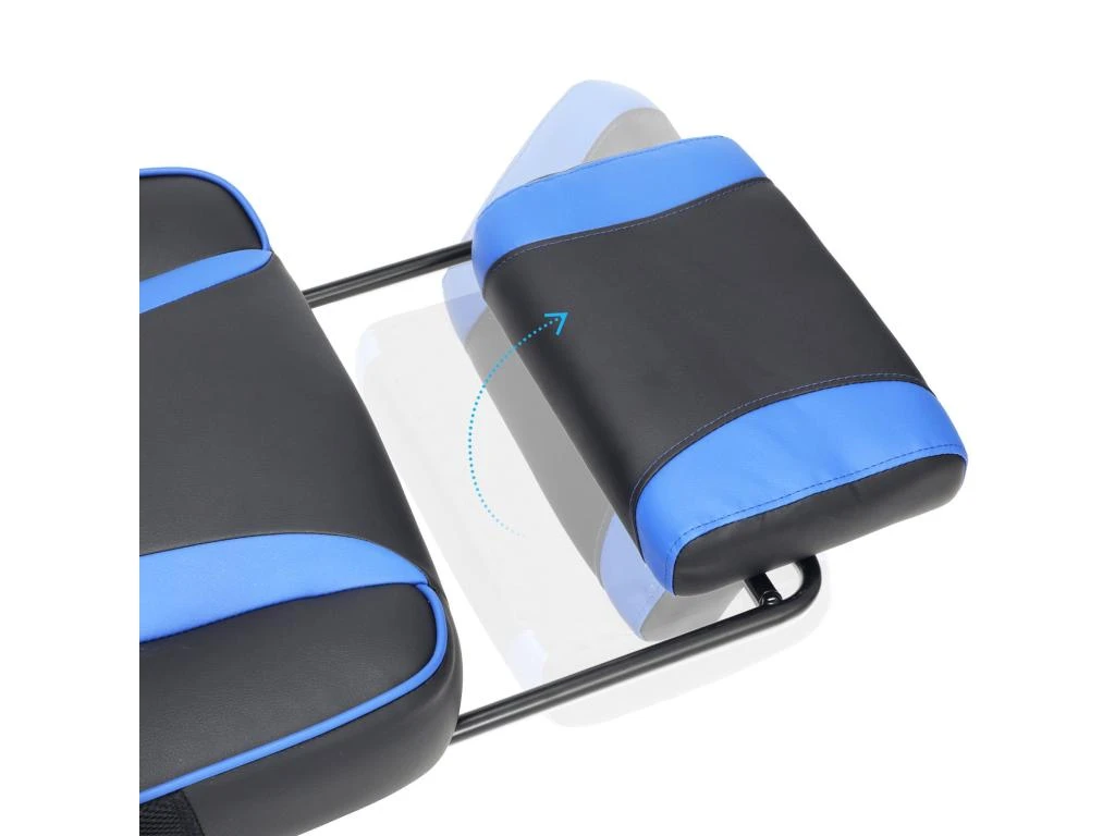 Le mélange de noir et bleu ainsi que la forme du haut du dossier rappellent les sièges de course.