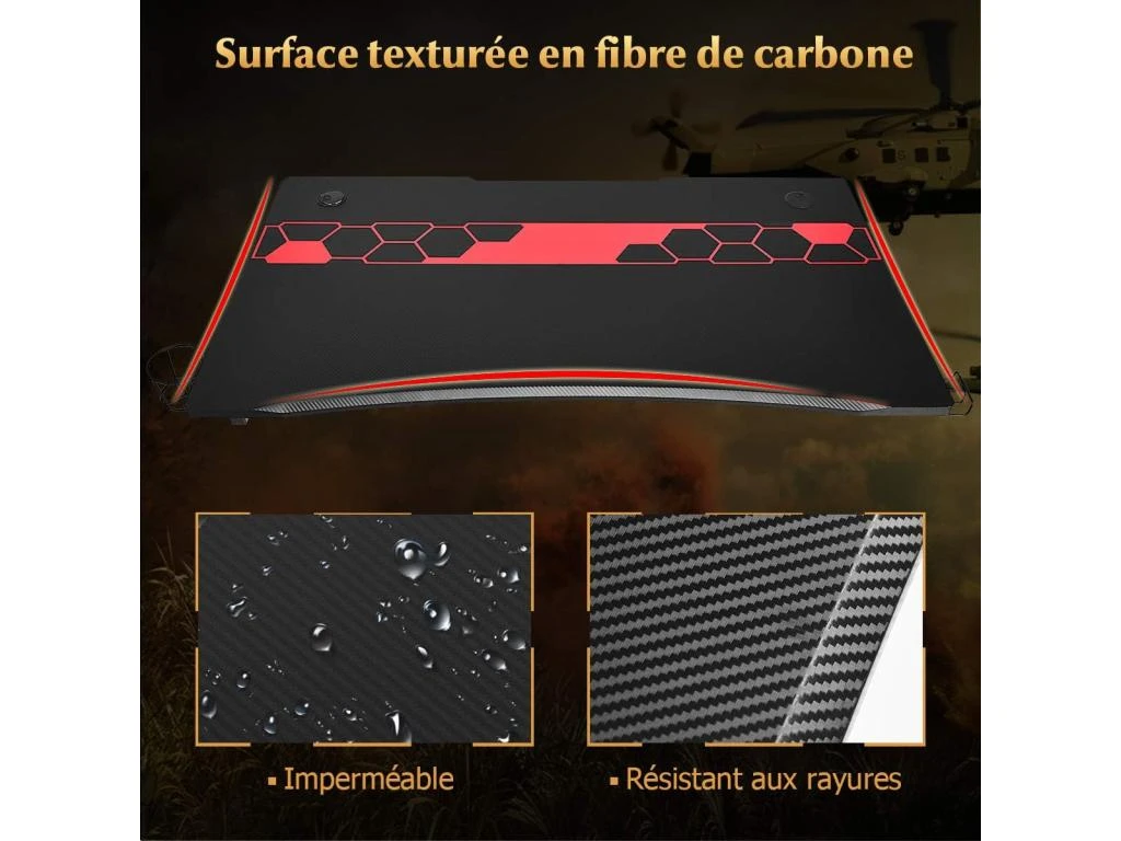 【Surface de jeu spacieuse】: Le bureau mesure 115 cm X 66 cm, il est conçu pour offrir suffisamment d’espace pour que les joueurs puissent placer divers équipements de jeu. En outre, la surface en fibre de carbone est plus résistante et plus confortable au toucher.