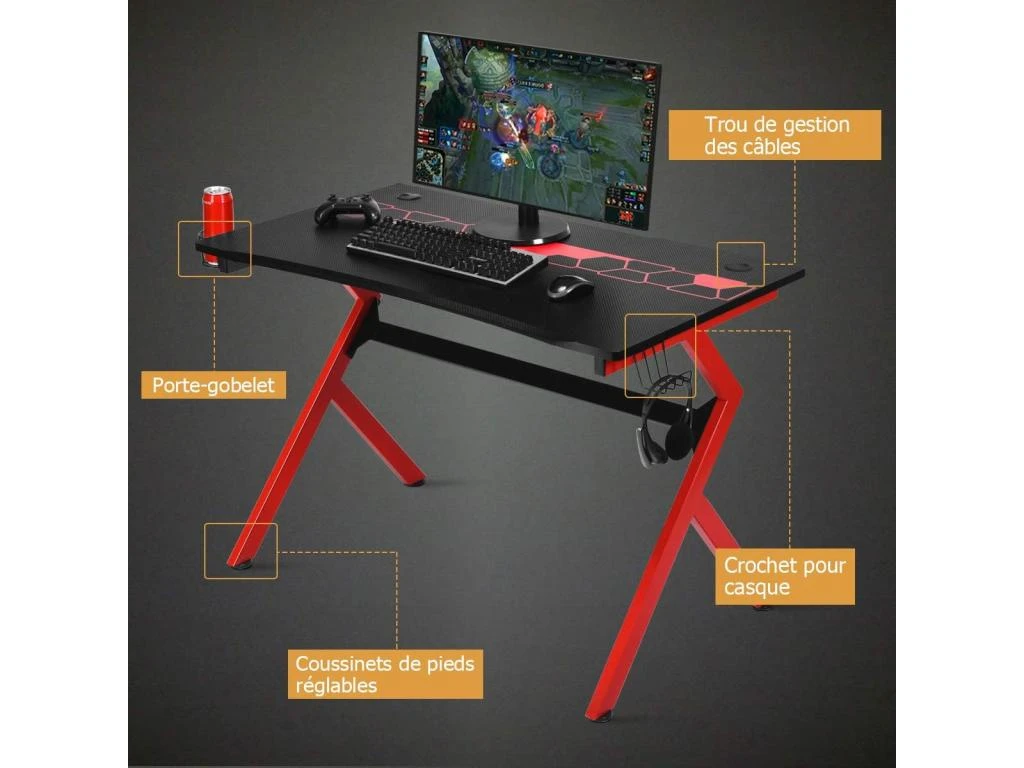 La table de jeu est équipée d’une prise pour écouteurs et d’un porte-gobelet, afin de libérer plus de place pour vos différents accessoires de jeu. Il y a deux trous pour la gestion des câbles, conçus pour garder les câbles organisés. De plus, la texture lisse de la fibre de carbone peut non seulement donner un aspect cool au bureau, mais aussi assurer le confort de vos mains pendant le jeu. Le bord avant ergonomique et incurvé est supérieur au bord horizontal rigide, ce qui améliorera l’expérience du joueur.