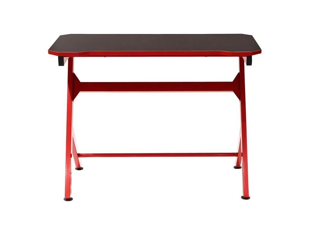 Structure en acier, coloris rouge. Armature plateau en panneau de particules, finition revêtement mélaminé.