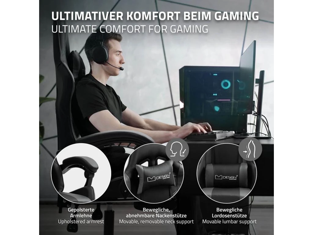 Détente pure avec la fonction de massage – Offre-toi la détente ultime pendant tes pauses de jeu ! Notre Gaming Chair dispose d’une fonction de massage au niveau des lombaires, qui te procure des vibrations de massage bienfaisantes après des sessions fatigantes. Il suffit de brancher le câble USB fourni et de profiter de l’agréable massage qui te préparera à la prochaine partie !